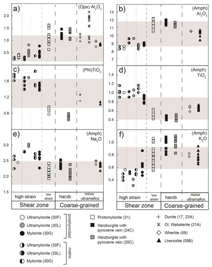 In this section, the variation in major element contents of the different mineral phases from coarse-grained harzburgites to sheared peridotites is discussed, taking into account the information about the bulk rock chemistry of the studied shear zone provided [,]. According to these authors [,], the sheared peridotites experienced a gain in Al2O3, K2O, and Na2O.