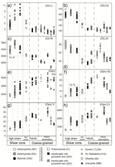 In orthopyroxene porphyroclasts, as for olivine, the concentration of Li, Co, Ni, and Zn is on average higher in the protomylonites and ultramylonites than in the coarse-grained ultramafics (Table 3). Orthopyroxenes from the shear zone are also characterized by slightly lower values of Ca, Sc, V, and Cr (Figure 7e–h) but higher values of Ti (Table 3).