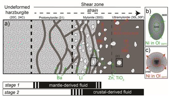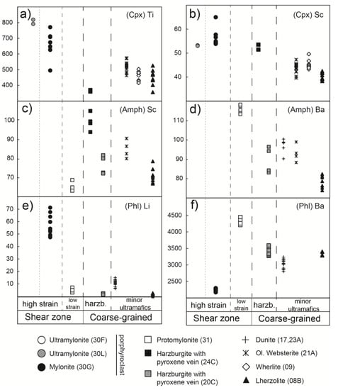 Significant variations of Li in phlogopite and Ba in amphibole and phlogopite were observed across the shear zone even though these mineral phases are not always present as porphyroclasts in the ultramylonites (Figure 8g,h). The higher Li content of phlogopite (up to six times on average) within the high strain zone (30G) with respect to the protomylonites of the low strain zone and coarse-grained ultramafics may suggest a net in-flux of Li within the shear zone (Figure 11a). It should be noted that the highest Li contents in phlogopite and olivine were obtained from the sample of the high strain zone that represents the transition from ultramylonites to protomylonites (Figure 11a). Both phlogopite and amphibole show higher Ba contents in protomylonites with respect to those from coarse-grained protoliths and the phlogopite in the low strain zone. This highlights a net in-flux of Ba at the transition (i.e., sample 31) between the coarse-grained harzburgite and the ultramylonites.