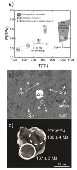 The Finero Complex was affected by different pre-Alpine tectonic events under granulite- to greenschist-facies conditions producing pervasive or localized foliations and isoclinal to open folds [,,,,,,,]. Discrete shear zones and pseudotachylites have received considerable attention over the past 40 years [,,,,], but the age of the different deformation events is still debated. Altenberger [] suggested that the shear zones were related to the Variscan cycle. Matysiak and Trepmann [] argued that the development of mylonites was connected to extensional tectonics in Jurassic times by analogy with what was reported for other shear zones in the Ivrea-Verbano Zone. The rare and unexpected occurrence of a single zircon grain within the fine-grained matrix of an ultramafic ultramylonitic sample (30F; Figure 10b,c) allowed us to discuss the age of activity of the shear zone. Zircon shows subround shape with lobate contours (Figure 10c). Under CL it is characterized a darker core, with a faint sector zoning, surrounded by an irregular thin rim with brighter CL emission (Figure 10c). Two LA-ICP-MS spots on this zircon provided one concordant U-Pb age at 187±3 Ma (Figure 10c) and a second discordant one (3.5% discordance) with a 206Pb/238U age of 180±4 Ma (Figure 10c and Table 5). Zircon has been observed as accessory in different lithologies within the Ph-Pd, i.e., chromitites [,,] and leucocratic dykes/pods/pegmatites [,]. The studied zircon was possibly inherited from one of these lithologies affected by shearing.
