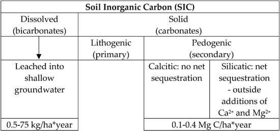 Types of soil inorganic (SIC) with numerical values of carbon sequestration in various soils (adapted from Lal et al. 2016 [7]).