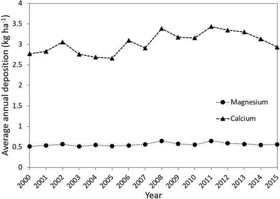 Temporal trends in average annual Mg2 and Ca2+ deposition values for the years 2000–2015 (National Atmospheric Deposition Program, 2019) [13].