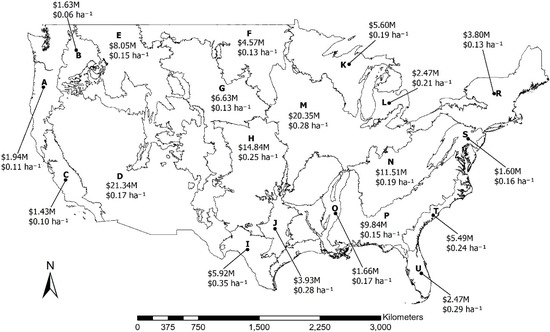 Land Resource Regions (LRRs) are defined by the U.S. Department of Agriculture (USDA) using major land resource area (MLRA) and agricultural markets, which are denoted using capital letters (e.g., A, B, C, etc.; see Table 5 notes). The contiguous U.S. (with the exception of Alaska and Hawaii) comprises 20 of the 28 LRRs (Figure 3). The LRRs with the highest average annual monetary values for non-constrained potential SIC sequestration were D ($21.3M), M ($20.4M), and H ($14.8M), whereas on an area basis the LRRs with the highest average annual values were I ($0.35 ha−1) and U ($0.29 ha−1) (Table 5).