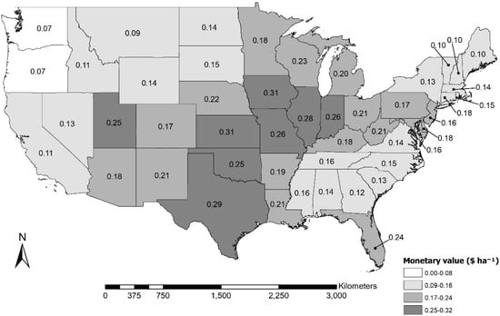 Average annual monetary values normalized by land area ($ m−2) of non-constrained potential soil inorganic carbon (SIC) sequestration from combined atmospheric Ca2+ and Mg2+ deposition (2000–2015) for different states in the contiguous United States (U.S.) based on an avoided SC-CO2 of $42 per metric ton of CO2 [16].