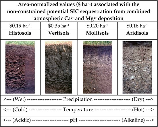 - Mikhailova, E.A.; Goddard, M.A.; Post, C.J.; Schlautman, M.A.; Galbraith, J.M. Potential contribution of combined atmospheric Ca2+ and Mg2+ wet deposition within the continental U.S. to soil inorganic carbon sequestration. Pedosphere 2013, 23, 808–814. [Google Scholar] [CrossRef]