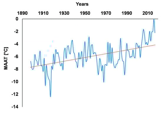 Mean annual air temperature (MAAT) at Svalbard Airport in the years 1898–2018, together with trend line [].