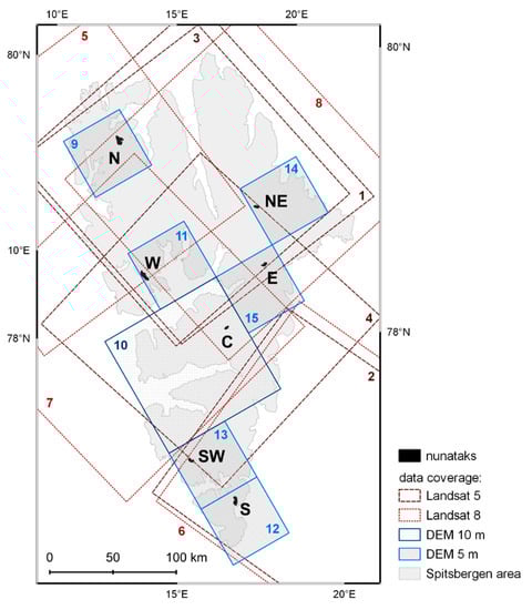 The spatial analysis presented here is based on satellite images from Spitsbergen, the largest island of the Svalbard archipelago. Approximately 60% of its area is permanently covered by different type of glacial ice. Large ice-caps dominate, bringing out complex systems of outlet valley glaciers separated by mountain ridges and nunataks. There are also many small cirques glaciers, especially in the western parts of Spitsbergen. Most glaciers are subpolar-polythermal, with their margins and parts of the ablation area below the pressure-melting point (PMP) (<0 °C), and therefore frozen to the ground. The accumulation part is considered temperate (at the PMP). Many small mountain glaciers are cold-type forms [].
