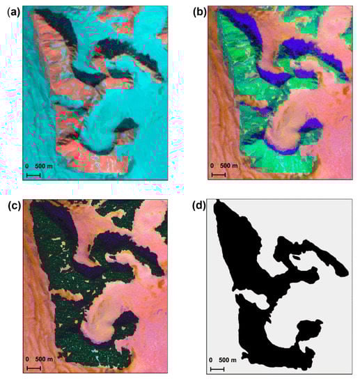 Identification of the glacier-nunatak border based on a Landsat satellite image (background based on the Landsat 5 scene ID: LT52170031986220KIS00, 8.08.1986, National Aeronautics and Space Administration (NASA) and U.S. Geological Survey (USGS)): (a) colour composition image based on the Landsat 5 TM 543 channels (and 654 for Landsat 8 OLI/TIRS) created using ArcGIS; (b) colour composition processing using Principal Components in ArcGIS; (c) raster to vector conversion using the red channel of the Principal Components in QGIS and extraction of DN < 130; (d) manual correction of the glacier-nunatak border in QGIS by removing the shaded parts of the glacier and moraine material on the ice and merge.