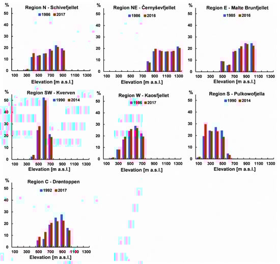 Seven nunataks from different parts of Spitsbergen which represent different altitude ranges (Table 2; Figure 4), were arbitrary selected as examples of the process studied: lower nunataks reaching 700–800 m a.s.l. in the southwestern part of the island, to thousanders in the North, East and central parts of Spitsbergen, and finally those reaching over 1300 m a.s.l. in the north-eastern parts. Examples from the western, southern and central parts of Spitsbergen, with slopes reaching altitudes associated to both accumulation and ablation zones of surrounding glaciers (equilibrium line altitude (ELA) of glaciers is on average at 350–500 m a.s.l. [,,]), present a more normal-type of elevation distribution. Nunataks located in the northern and eastern parts, and indeed mostly within the accumulation zone, are more asymmetrical in their elevation distribution, mainly dominating the higher elevation ranges. Nunataks differ in their shape, both in the orientation of their main axis but also in relation to how compact they are. The most compact nunataks are characterized by the highest elevation of the nunatak-ice boundary (above ELA). The average nunatak area at the turn of the 1980s/90s was 5.17 km2, and increased by 14.7% to an average of 5.93 km2 to 2014–2017. Nunataks at lowest altitudes from the southern and western parts experienced the largest changes, with an area increase of 26–29%. The smallest changes were identified at high altitude nunataks from the eastern and north-eastern parts, with a change of ±1–2%.