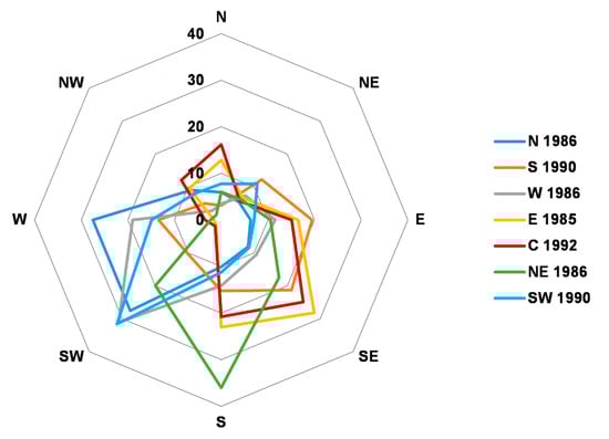 Percentage share of slope exposure for the nunataks visible on images from 1985–1992 in Spitsbergen.