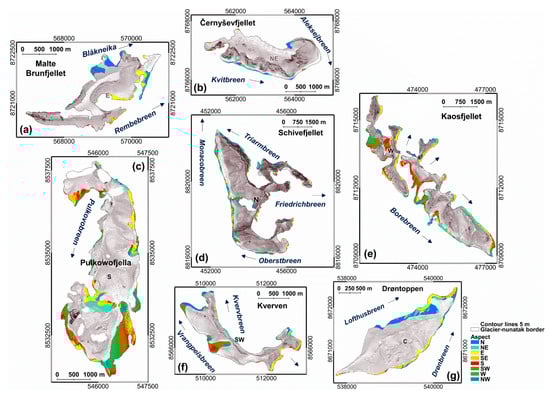 Changes observed from Spitsbergen nunataks area in relation to the aspect of their slopes in 1985–2017: (a) region E—Malte Brunfjellet; (b) region NE—southern part of Černyševfjellet; (c) region S—Pulkovofjella; (d) region N—Schivefjellet; (e) region W—Kaosfjellet; (f) region SW—Kverven; (g) region C—Drøntoppen (source of dense contour lines: ArcticDEM digital elevation model []); the arrows point to the glacier movement direction.