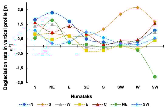 Considering all the nunataks studied here, the deglaciation during the study period mainly influenced the northern and north-eastern slopes, reaching an average rate of decrease of 1.2 m a−1 (Figure 8). Southern slopes showed the slowest rate of deglaciation, reaching an average of 0.2 m a−1 decrease in mean elevation.