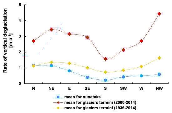 Average rate of relative decrease of the mean nunatak elevation in relation to the slope exposure for the 1985–2017 period, in comparison with the average rate of increase of the termini altitude of glaciers terminating on land (1936–2014 and 2000–2014 periods, based on data in Szafraniec []).