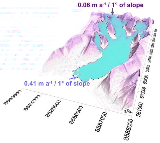The rate of vertical deglaciation of the nunataks in relation to the aspect of their slopes correlates well with the rate of changes of the termini altitude of Spitsbergen glaciers ending on land (see Figure 8) []. However, the maximum rate of exposure of nunataks applies to north-facing slopes, which has increased over the 21st century.