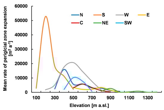 An analysis of the changes in the nunatak areas between 1985 and 2017 shows that expansion of the periglacial zone depends both on the slope exposure and the altitude of the nunataks. The higher the elevation, the smaller the increase in slope area, especially for south-facing nunataks. The average rate of deglaciation was also calculated here to ultimately estimate the rate of expansion of the periglacial zone from the top of the glacier for selected altitude levels. Spitsbergen nunataks are very diverse in this respect (Figure 10). However, they all have in common a clear maximum deglaciation rate which relates to the average nunatak altitude. Thus, lower nunataks show the highest maximum deglaciation rates. This value decreases with the glacial altitude down to ca. 500–3000 m2 a−1, probably due to shading, low level clouds entering the valleys and persistent fogs (such conditions occur, for example, in Hornsund for approximately 10% of the year []). It also decreases up the glacier, where it can even reach a situation of inversion associated with an air temperature gradient and the processes within the accumulation zone (e.g., snow blowing, avalanche supply).