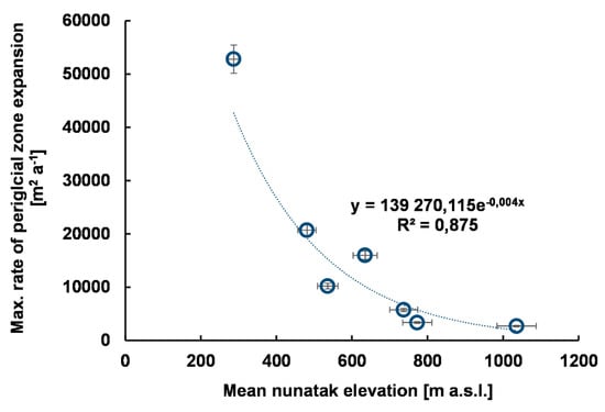 The maximum surface deglaciation rates along a vertical profile have been compared with the mean elevation for Spitsbergen nunataks (Figure 11). These two variables relate in an exponential way to some extent and this relation is significant at a 0.05 level. This suggests that for a mean nunatak altitude of 640 m a.s.l. the maximum surface deglaciation rate can reach 10,000 m2 a−1. To check how solid is this relationship, the sample size must be larger and, therefore, more examples in terms of geographical location, altitude and the course of the main axis of the nunatak are required.