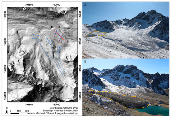 Glacier forefield Muragl. The positions of the electrical resistivity tomography (ERT) profiles (blue lines) and ground-penetrating radar (GPR) profiles (red lines) as well as the viewpoints of the photographs are marked in the map. The former ice flow direction is illustrated by blue arrows. The investigated thrust moraine complex is highlighted by yellow lines in photographs (A,B).