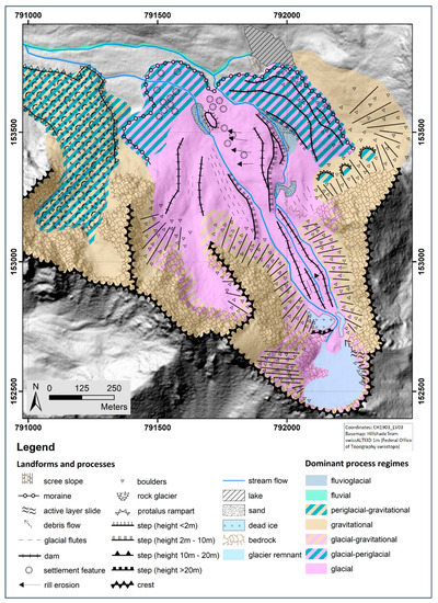 Glacier–permafrost relationships were initially studied on polar and subpolar glaciers more than 50 years ago. Mathews and Mackay [1] investigated the deformation of proglacial unconsolidated sediments in periglacial environments. In the context of thrust moraine evolution at polar and subpolar glaciers, Kälin [2] provided evidence on glacier–permafrost interaction for the first time. Further important studies in this context dealt with the deformation of frozen sediments [3] or the interaction between frozen proglacial sediments and the subglacial hydraulic system [4,5]. Hambrey and Huddart [6] and Bennett [7] presented multi-processual models of moraine genesis through glacier–permafrost interaction. In these studies, the properties of the glacial stress field, glacial flow patterns, the sub- and proglacial hydrological system as well as the properties of the proglacial sediments were also considered.