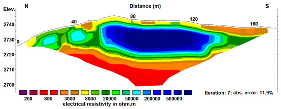 The determination of different ice types is more complex. In the context of this study, two different types classified by Shumskii [31], namely sedimentary ice and congelation ice, are particularly important. The fact that determination is possible with geoelectrical methods has already been shown in some studies; the boundary value of the electrical resistivity values between the two ice types was determined at a few MΩm (for glacier ice in the European Alps). According to King [42] or Vonder Mühll [20], the resistivity values of congelation ice are between 10 kΩm and a few MΩm, whereas the values of sedimentary ice are more than 10 MΩm. The resistivity values of the anomaly in the central part of the moraine complex were higher than 1.5 MΩm, which is therefore lower than the assumed threshold value. Nevertheless, former ERT measurements on the Muragl glacier proved that the resistivity values of the glacier ice were around 2 MΩm in some areas [15], and are therefore similar to the values detected within the moraine complex.