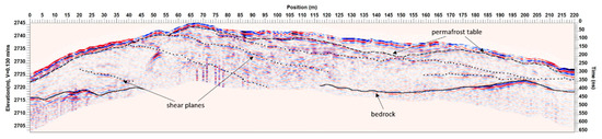 Results of the GPR surveying confirm these results and present new insights into the internal sedimentological structure of the moraine complex. In the central part of the moraine complex, CMP measurements (not shown) confirmed the assumption of a massive ice core because of high signal propagation velocities. These high values of around 0.16 m/ns are indicative of massive sedimentary ice and exceed the normal range of permafrost, determined as being between 0.11 and 0.15 m/ns in the common literature [37,38,39,40].