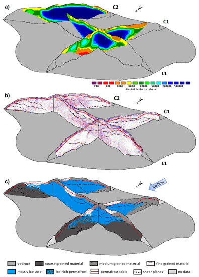 When comparing the depth of the lowermost reflector and the results of the ERT measurements, a coincidence between the two data sets occurs. The location of the bedrock reflector and the boundary between the high resistivity anomaly and the underlying low resistivity layer in the central part of the moraine complex correspond to each other. Accordingly, it can be assumed that the low resistivity layer at the bottom of the profiles C1 and L1 is to be equated with unfrozen bedrock beneath the frozen moraine material. Another comparison of the results from ERT and GPR shows that the reflection intensity and density in the GPR data are noticeably higher in the areas of the high resistivity anomalies of the ERT data. This is surprising at first, assuming that the center of the moraine is characterized by a massive ice core. The strong reflections do not deny this; however, they indicate a high degree of impurity of the ice or a high proportion of debris in the ice. Assuming that this is basal thrusted glacier ice of the basal and frontal parts of the glacier, such a concentration of debris would not be unusual but is even to be expected. The assumptions of the internal structures of the moraine complex were summarized in a conceptual model, which is shown in Figure 5c. It presents a schematic model of the internal moraine structures including the massive ice core, the ice-rich permafrost lenses in the outermost moraine ridges as well as linear structures like the permafrost table and the detected shear planes. Additionally, the different dominating clast size of each moraine ridge or thrust block is presented.
