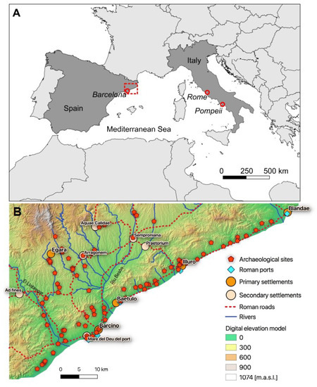 The Laetanian Region, although not clearly defined, is an Iberian ancient territory located in the Northwest of Hispania Citerior-Tarraconensis Roman province on the present-day Catalan coast of Spain (see Figure 1). It includes several urban centres that already existed in Roman times including Blandae (today Blanes), Iluro (today Mataró), Baetulo (today Badalona) and the colony of Barcino (today Barcelona). The study area is bordered to the south and southeast by the Mediterranean Sea and has a flat coastal strip of varying width, which merges into a littoral mountain range towards the northwest. In the hinterland stretches the extensive Vallesian Plain situated between the Arnum River (today River Tordera) and the Baetulo River (today River Besós), and the smaller Barcelona’s Plain situated between the latter and the Rubricatum River (today River Llobregat; [13]). These main rivers supplied fluvial sediments which were redistributed southwards by longshore marine currents and shaped the coastal and wetland plains of the present Maresme, Barcelonès and Baix Llobregat shires [14,15]. To the north, the Vallesian Plain is bordered by another pre-littoral mountainous range. On the northwestern edge of this plain, the Flavian municipium of Egara is situated. To the south, the thin coastal fringe ends in the foothills of the Garraf massif [13].