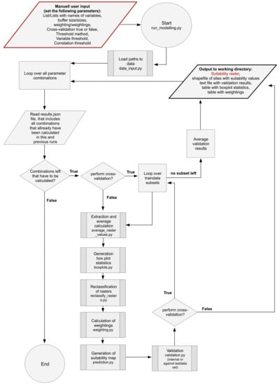 The general modelling methodology described in the following was developed by Vogel [8]. However, in the present study, it was largely refined. One major objective is to semi-automate the modelling process since not all topographic and socio-economic characteristics at hand contribute to an improvement of the model performance. Consequently, two different modelling approaches were applied and compared. At first, the modelling was first carried out using predictor variables that are selected on the basis of expert knowledge and the results of previous research studies. In a second approach, the predictive models were calculated with subsets of variables that were automatically selected based on measures of statistical dispersion. In the present study, the programming language Python [49] was used. The developed script is based on several modules, which are executed by sub-scripts. Each module combines partial steps of the methodology to a logical unit and is explained in the order of execution: