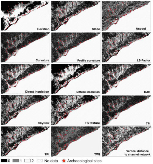 The application of geographical information systems (GIS) has considerably increased in the last decades [1] and can be used for a wide variety of subjects and research questions. In the 1990s, one particular scientific field experienced a ’boom’ in GIS applications: archaeology [2]. One issue that has always been important in the application of archaeological GIS is predictive modelling. Their first occurrence dates back to the 1970s, but their development especially increased with the widespread popularity of GIS [2]. The aim of applying a predictive model is to envisage the potential of undiscovered archaeological site locations based on observed patterns in the environment and/or assumptions about human behaviour [3,4]. The basis of such models is that the spatial distribution of cultural remains, which are represented in archaeological sites, is the result of human decision-making activities within the framework of the surrounding environment. Predictive models have many advantages: They are cost-effective and useful for the identification, protection, and management of increasingly threatened cultural resources. Most contemporary predictive modelling approaches combine information from multi-thematic location characteristics relating to past environmental and/or cultural conditions [5]. These are the predictor variables. With them, the suitability of areas for the occurrence of archaeological sites, i.e., the response variable, can be determined. The more frequent use of predictive modelling can, therefore, certainly also be attributed to the increasing availability of data that can be used as predictor variables. Remote sensing can complement conventional observation and data acquisition even in areas that are difficult to capture by other methods. In particular, high-resolution digital elevation models (DEM) can be used to derive important landscape parameters and, therefore, variables for modelling.
