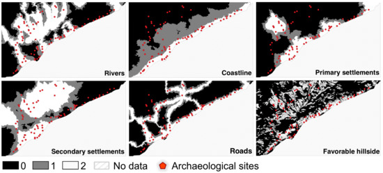 Figure 5 shows the reclassified rasters of cost distances to the different socio-economically relevant locations. Comparing the coast and the roads rasters, it is noticeable that one of the splitting arms of the Via Augusta, the main ancient road of the region, runs close to the coastline. In that respect, these two variables show largely overlapping spatial features. Around the settlements, larger areas of suitability arose that show a very irregular shape. Here, it can be seen again that the topography in the region is strongly textured and not easily accessible.