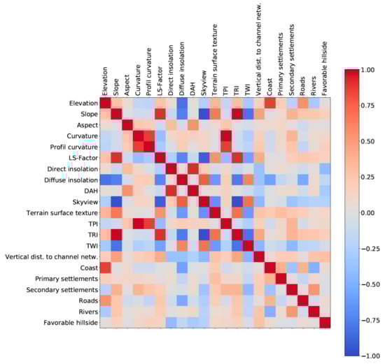 The results of the reclassified rasters of topographic predictor variables are shown in Figure 4. It is noticeable that most of the topographical parameters show striking similarities. The central coast appears more or less as a white band in the vast majority of topographic rasters, because it is largely reclassified as suitable (value 2). The mountainous region behind the coast was mostly classified as unsuitable (value 0) and, therefore, appears as a black area. The region behind, the Vallesian Plain, shows branch-shaped white patterns of areas classified as suitable, which is connected to the coast by a passage located in the north of Barcelona’s Plain. How strongly these suitable areas are connected differs from raster to raster. The elevation raster, for example, shows strongly contiguous areas, since the height generally increases rather gradually in the terrain. Other variables, on the contrary, which have strong fluctuations in small distances, show much more noisy reclassifications, for example curvature and TPI. A closer look reveals another difference that only applies to the Vallesian Plain. Although this plain is often reclassified as suitable, some rasters in this area seem to be some kind of negatives of other rasters. An example is the LS-factor and the direct insolation. The LS-factor raster has large unsuitable areas correlated to the positions of rivers in the plain. In the case of direct insolation, on the other hand, exactly these areas are shown to be suitable. These features and patterns are less obvious in the distance to the channel network raster. In the aspect raster, spatial patterns can only be guessed. The southeastern slopes of the Central Coast region, which are reclassified as suitable, are slightly noticeable. In general, it can be summarized that some of the variable rasters could be sorted into groups of similar appearance. The results of visual analysis are supported by the correlation matrix (Figure 6). It shows that some variables are strongly correlated. This applies to slope, LS-factor and TRI but also curvature, profile curvature and TPI received high Pearson’s correlation coefficients (PCC). Thus, it is reasonable to exclude the correlated variables from the modelling.