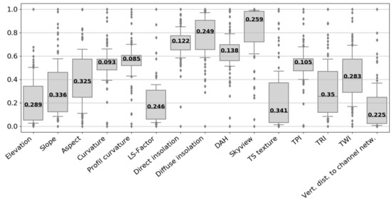 As described earlier, it is assumed that the variables that control the distribution of sites tend to have a lower IQRnorm than variables which are of no effect. As can be seen in Figure 7 and Figure 8, the IQRnorm varies significantly for the different topographical variables. Curvature, profiles curvature, direct insolation, DAH and TPI show comparatively lower IQRnorm. For these variables, most sites occur in a lower value range. The lowest IQRnorm of all variables was reached by the profile curvature with 0.09.