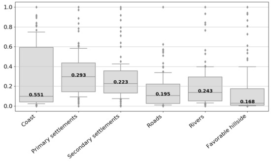 In a next step, the percentile values are used to reclassify the predictor variable rasters. To every raster cell with a value inside of the box (IQRnorm) the new value of 2 was assigned, every cell with a value inside the whiskers received the new value of 1. Every cell outside the box and whiskers was set to the new value of 0. The described reclassification is applied to each topographical variable [51]. The reclassification for the cost distance variables was modified. Here, it can be assumed that the lowest costs (i.e., the lowest energy expenditures) are best for the location of a wine press since the facilities were preferably built close to settlements, roads etc. Therefore, all data points up to the 50th percentile (Median) were reclassified to 2, those within the 75th percentile to 1 and those above, i.e., points with high cost distances, to 0. It is assumed that the values within the box correspond to the actual well-suited value range for viticulture of the corresponding predictor variable. For the outliers, or anything outside box and whiskers, it is expected that these are actually marking the less favorable locations to settle a wine-pressing facility, which is why there are fewer data points to be found in that value range. However, the area where a site is located does not have to be completely unsuitable. Other location factors may be suitable in these places, which is why the facilities have settled there. In order to determine the overall suitability of each position in the research area, all predictor variables have to be considered in combination.