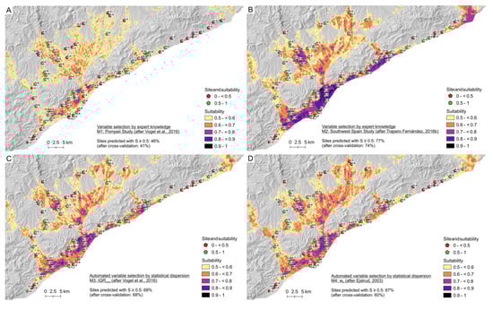 One preselection was based on the work of Vogel et al. [8] a model of villae rusticae in the hinterland of Pompeii. Table 2 shows the predictor variable combination. The response variable was buffered with 100 m diameter and the weighting wE was used. Figure 9A illustrates the resulting suitability (S) map of model M1 showing only favorable areas with S ≥ 0.5. The result is reminiscent of the topographical scheme: the coastal region is predominantly classified as suitable, as is the area around the Llobregat River and the branched Vallesian Plain. An area with a comparatively large contiguous zone of high suitability (S ≥ 0.7), is the centuriatio plain or ager barcinonensis, located around ancient Barcino’s colony [25]. At first sight, these correlations make a pretty positive impression on the model performance. However, a closer look reveals that the archaeological sites are rather situated on the edge of the high suitability areas. Moreover, in the northern coastal area, many sites could not be predicted by the model.