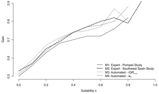 In the expert knowledge model M1 based on the study of Pompeii’s hinterland (after Vogel et al. [8]) only 46% of sites were predicted with a suitability value of S ≥ 0.5 for the Laetanian Region. After cross-validation, this value decreases to 41%. The Pompeii model itself reached quite higher values of 76% (71% after cross-validation) in their prediction of rural settlements around Pompeii. The gain statistics in Figure 10 are also lower than in the Pompeii study. Therefore, it can be concluded that the corresponding variable combination that worked well to predict the distribution of villae rusticae around Pompeii holds not as much explanatory value to model the distribution of winegrowing facilities in the Laetanian Region. Therefore, a better adapted model has to be found for the specific topic of viticulture in this research area.