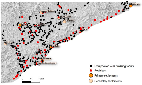 The point locations of the ancient Roman cities (hereafter referred to as primary settlements) Barcino, Baetulo, Blandae, Iluro and Egara and the smaller, secondary settlements such as Ad fines (today Martorell), Arragonem (today Sabadell), Aquae Calidae (today Caldes de Montbui), Semproniana (today Granollers) and Praetorium (today Llinars del Vallès) were used [36]. It is assumed that settlements interacted as communication nodes. Thus, they were important consumption and redistribution centres for the local or regional wine producers and dealers [37].