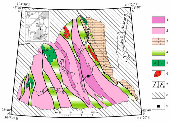 Schematic geological map of the Anabar Shield. (1–3) Archean and Early Proterozoic metamorphic rocks: (1) Daldyn Group; (2) Upper Anabar Group; (3) Khapchan Group; (4) Early Proterozoic shear zones. (5) Intrusive rocks: (A) anorthosite and (G) gabbroids. (6) autochthonous and parautochthonous granitoids. (7) Major faults: (a) steep faults and (b) overthrusts. (8) platform cover; (9) area of Figure 2.