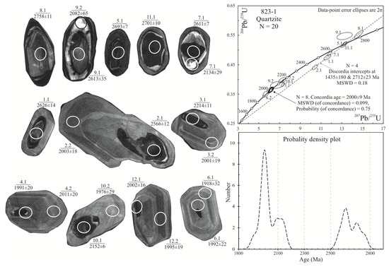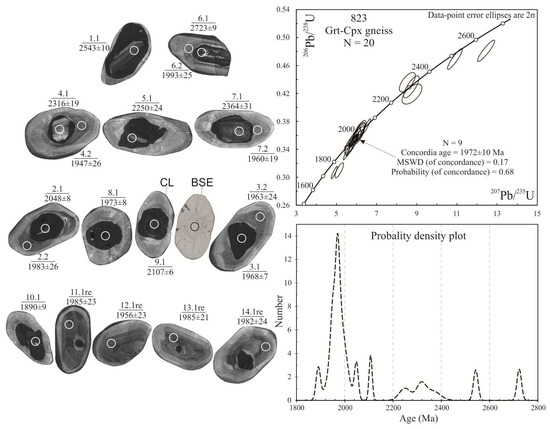Age dating was performed for zircons from coarse-grained Grt-Cpx gneisses (sample 823), garnet quartzite (sample 823-1), and quartzite (sample 523) (Table S2). In outcrop 823, a similar zircon monofraction from coarse-grained Grt-Cpx gneisses and garnet quartzite consists of yellow transparent and semi-transparent prismatic and rounded idiomorphic and sub-idiomorphic crystals and fragments. The crystals are 200–400 µm long, with a coefficient of elongation (Ky) of 1–2. The zircon grains are polygenetic in CL image; three zircon generations were identified (Figure 6). The cores dominantly display poor luminescence, sometimes (grain, point with analysis 8.1) with fine rhythmic zoning. Some of the cores are surrounded by thin brightly luminescent rims (analytical points 9.2 and 7.2) varying in width, partly dissolved upon being overgrown by rims, which shows grey luminescence. The grey rims are much thicker; such grey luminescent zircons make up individual coarse grains with coarse concentric zoning and the sectorial structure of the central portions of crystals. Grey zircons from gneisses display a concentric structure and finer rhythmic zoning around the black cores. The internal rhythmic zones and lighter external rims of the gneisses were dated separately. The neoformation of zircon in the quartzites is well-defined, but detrital zircons in the cores are much worse preserved. The radial fracturing in the back-scattered electron (BSE) image is conspicuous. Fractures begin to form at the boundary of cores that are dark in CL and spread into zircon grain, which is grey in CL, towards the grain margins. The fracturing was caused by a differentiated and more intense zircon metamictization and by the increasing volume in the U- and Th-enriched cores, and was followed by the alteration of low U- and Th rims [28].