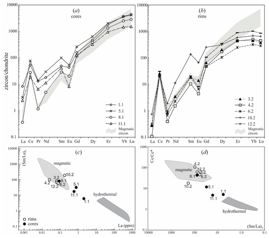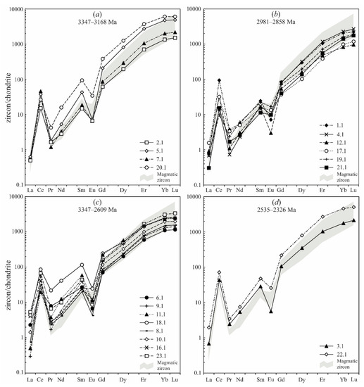 (a–d)—Chondrite-normalized REE patterns of zircons from the quartzite, sample 523. Pattern numbers correspond to the numbers of analytical spots in Figure 9. The grey field corresponds to the composition of magmatic zircons according to [29].