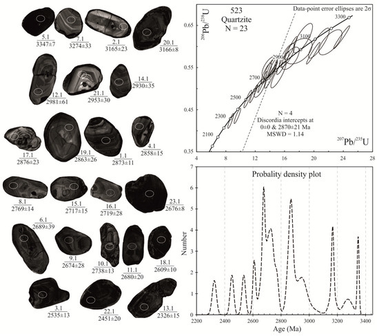 CL images and age of zircons from the quartzite, sample 523.
