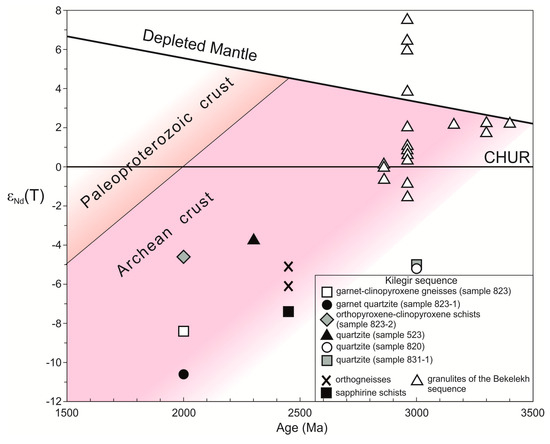 Sapphirine schists and orthogneisses of the Kilegir sequence [30], like the quartzites we studied, were characterized by negative values of εNd(T) from −7.4 to −5.1 and a model age of protolith TNd(DM-2st) = 3.43–3.25 Ga. Thus, the protolith of the granulites of the Kilegir sequence studied by us and [30] was formed due to the processing of the Archean and Eoarchean continental crust.
