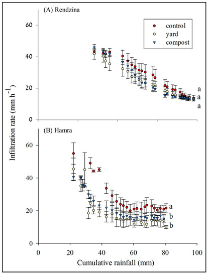 Infiltration rates for Rendzina (A) and Hamra (B) soils, with no addition of organic matter (control), and addition of yard manure (yard) and compost. Different letters “a” and “b” indicate significant differences between treatments.