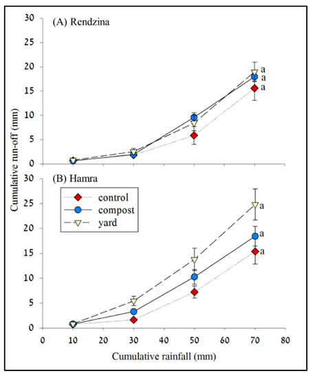 Cumulative runoff for Rendzina (A) and Hamra (B) soils with no addition of organic matter (control), and addition of yard manure (yard) and compost. The ”a” letters indicate statistical significance.
