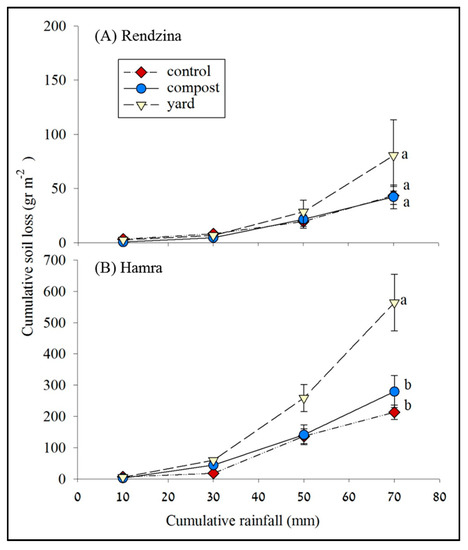 Cumulative soil loss for Rendzina (A) and Hamra (B) soils, with no addition of organic matter (control), and addition of yard manure (yard) and compost. Different letters ‘a’ and ‘b’ indicate significant differences between treatments.
