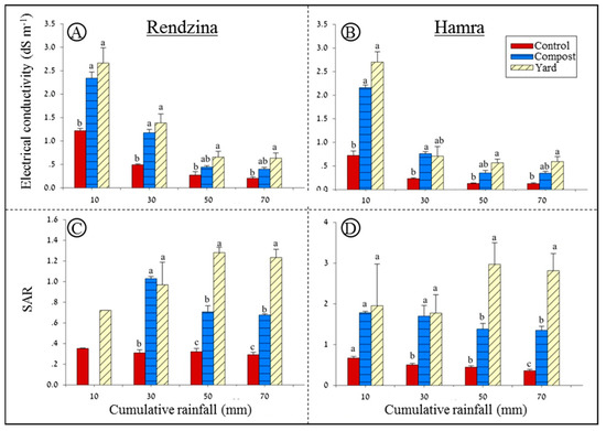 For cumulative rainfall of 50 mm and above, where SAR and EC readings are stable, in the Rendzina soil, the addition of compost and yard manure resulted in elevation of SAR by two and three folds, respectively, compared to the control. Absolute values were in the order of 0.7 and 1.3 for the compost and yard manure, respectively. However, in the Hamra soil, the increase in SAR was much greater, due to the addition of the two manures, with absolute values of 1.5 and 3 for compost and yard manure respectively (Figure 4C,D). These values are 3 and 6 times higher respectively, compared to the control.