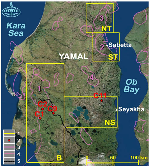 Gas blowout craters in the central part of the Yamal Peninsula. (1) Areas of detailed studies of Oil and Gas Research Institute of Russian Academy of Sciences (OGRI RAS): B, Bovanenkovo; ST, South Tambey; NT, North Tambey; NS, Neito-Seyakha. (2) Craters of gas blowouts C1, C2, C9 and C11. (3) Gas and gas condensate fields including those marked with pink color: Bovanenkovo (1), South Tambey (2), North Tambey (3) and West Seyakha (4). (4) Gas pipeline Bovanenkovo-Ukhta. (5) Railroad. Basemap—ESRI standard imagery.