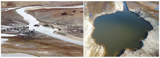 The revealed C11 Crater was flooded (Figure 2a), as its center was located near the right bank of the Myudriyakha River, as determined by visual approximation. The crater had an asymmetric elongated form, covering an area of ca. 50 m × 70 m. In the vicinity of the right bank, a local zone of gas emission was detected in an area with a diameter of up to 3–4 m (Figure 3a,b, red arrows) [33,34]. The ascending flow of gas bubbles had formed a slightly elevated zone on the water surface, and also the local water turbulence. Methane content in the air, measured with a gas analyzer Ventis VX4, differed from the background values to 0.5–1.5% over the zone of the gas seepage. It is worth noting that in July 2014, the methane content in the area of the Bovanenkovo C1 Crater changed from 0.3–2.8% to an especially dangerous concentration of 9.6–9.8% directly in the crater [43].