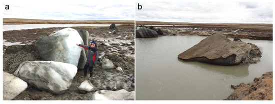 During the area observation on 2 July 2017, 117 of the most significant (concerning size and character of falling) fragments of ground ice and rocks (Figure 3 and Figure 4) were revealed as well as the depressions of impact origin. Among the objects, the most remarkable were the giant fragments of frozen ground and ground ice. The largest one, broken into two parts, was located in the river channel on the southwestern edge of the crater. The recognizable maximum size was ca. 4 m × 8 m × 10 m (volume of ca. 100–150 m3) (Figure 3a and Figure 4b), but was probably larger, as its underwater part was difficult to assess.