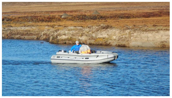 GPR survey can be used for studying the bottom structure of water areas with fresh water, from ice in winter, and from a boat in summer. The authors conducted a GPR survey on the land, lake, and river from the motor boat “Fregat” (Figure 5). The main disadvantages of GPR survey include a small depth of penetration and the impossibility of using it in the case of significantly saline water, which constrains the propagation of electromagnetic waves.