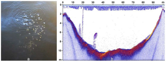Gas emission (photo by Igor Bogoyavlensky) (a) and NW–SE echo sounding section (b) with three gas flares on the Seyakha C11 Crater flooded by the river.