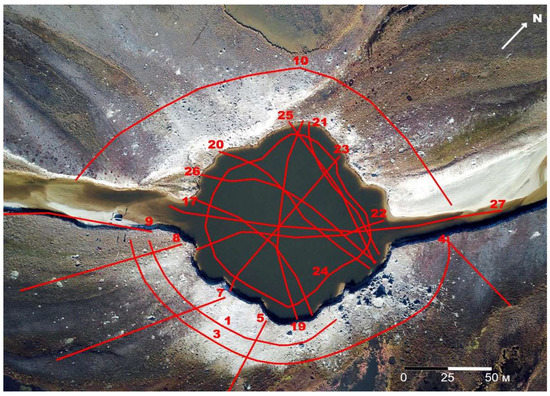 The GPR survey was conducted for radial and circular lines within the water area and also on the land near the crater (Figure 7). The GPR was placed at the bottom of the rubber boat for surveying the lake and the river (Figure 5). Eighteen sections of good quality data were acquired, with a total length of 2478 m.